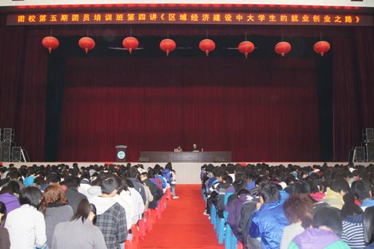 11月7日上午,太阳成官网团校第五期团员培训班第四讲在体育馆举行,著名区域经济学家、湖南师范大学博士生导师朱翔教授应邀做了题为“区域经济建设中大学生的就业创业之路”的讲座。副校级督导员李凤莲出席并主持了讲座。