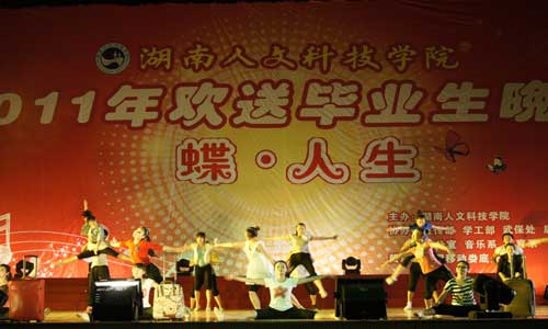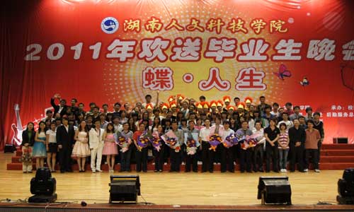 6月2日晚,主题为《蝶·人生》的2011年毕业生文艺晚会在新体育馆隆重举行。校长郭军,党委副书记李尚益,副校长刘铁铭、周发明,纪委书记李凤莲等校领导与全校3000余名师生一起观看了晚会。