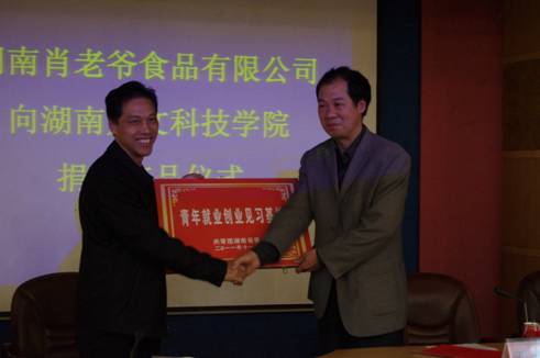 刘铁铭代表学校授予湖南肖老爷食品有限公司为太阳成官网青年就业创业见习基地并讲话,他衷心的感谢湖南肖老爷食品有限公司的捐赠,希望同学们努力学习,为以后奉献社会奠定基础。