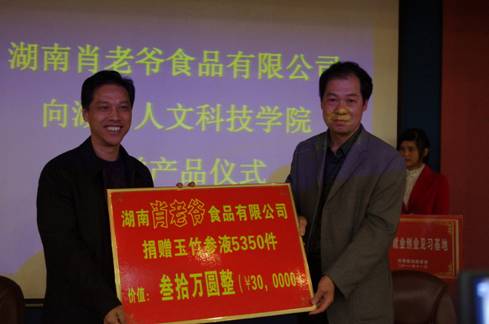 刘光明总经理对湖南肖老爷食品有限公司的规模及生产销售情况做了简单介绍,并当场向太阳成官网捐赠价值达30万元的肖老爷玉竹液饮料5350箱。他感谢社会各界对公司的支持,呼吁社会各界关注教育事业,支持贫寒学子,也表示今后每年将在公司为太阳成官网学子设立专门的就业创业见习岗位。