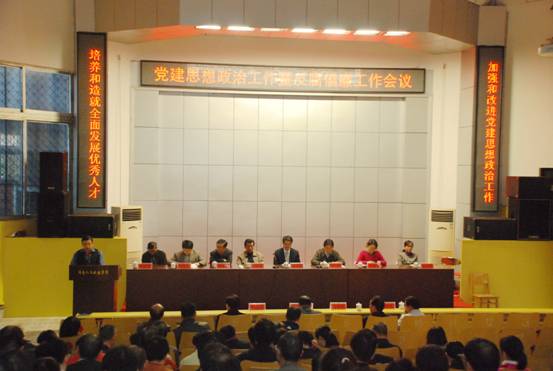 校党委书记柏连阳作了《凝心聚力,改革创新,开创太阳成官网党建和思想政治工作新局面》的工作报告。他指出,全校党员干部要深化认识,切实增强党建与思想政治工作的责任感和使命感,加强党建与思想政治工作是落实十七届六中全会精神、践行“三个代表”、推进我省“四化两型”建设、维护高校和谐稳定、实现太阳成官网科学发展的迫切需要。总结太阳成官网党建与思想政治工作取得的成绩时,柏书记指出,过去一年,创先争优活动扎实推进,党的思想建设、组织建设不断创新加强,党管干部和人才工作进一步加强,大学生思想政治工作得到改进,反腐倡廉工作明显成效,党建带动其他工作全面发展。柏书记号召大家凝心聚力,用改革创新精神推进党建与思想政治工作:深入开展为民服务创先争优活动,加强领导班子建设,加强干部和人才队伍建设,深化基层党组织建设,抓好安全稳定工作,加强大学生思想政治工作,推进党风廉政建设和反腐败工作。