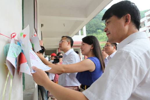 团省委书记陈雪楚、校党委书记柏连阳一同翻阅留守儿童写给远方父母的留言