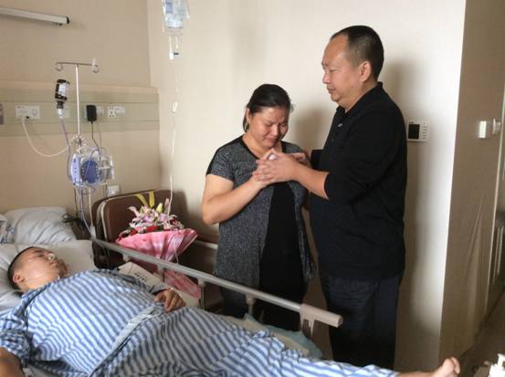 在重症病房里,化学与材料科学系党总支书记刘志成代表学校将第一批爱心捐款12万元交到了张赟祥母亲的手上,校团委副书记魏彦煜代表学校明德读经班转达了祝福信及善款5432元。随后,化学与材料科学系副书记刘桂英和学生代表郭处源为张赟祥朗读了全班同学的短信祝福,鼓励他勇敢战胜病魔,早日回到校园。张赟祥妈妈非常感动,多次泪流满面,泣不成声,她哽咽着说:“前段时间的手术和住院的费用已经花了近20万,都是找亲友东拼西凑的,明天就要搞放疗了,正在为费用发愁,学校真是雪中送炭,感谢学校领导、感谢同学们及社会各界人士的关心!”随后,化学系团总支书记、班主任李郝老师陪同张妈妈前往银行开通了爱心账号,学校代表和主治医生进行了沟通,沈医生介绍说:目前为止,张赟祥肿瘤切除手术较为成功,恢复稳定,但暂时不能发声说话,下阶段将进行长达6周的放射性治疗。