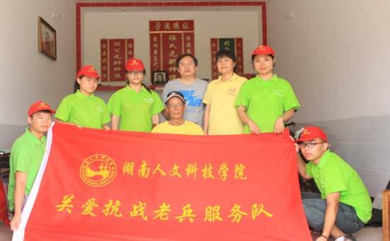 为激励当代大学生弘扬革命传统,勿忘国耻,奋发图强,实现中华民族伟大复兴,校团委于7月17日至9月3日组织20名大学生志愿者,利用暑期社会实践活动,对娄底籍的抗战老兵积极开展寻访慰问活动。活动中,志愿者的足迹遍布娄底各个县市区乡镇,共寻访慰问抗战老兵26人,为他们送去了凉席、收音机、油米等生活用品,并形成了《娄底籍抗战老兵生活现状》的调研报告,活动也得到了娄底市民政局、娄底市抗战老兵志愿者协会的大力支持和肯定。