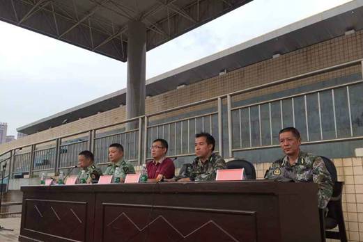 9月15日上午,太阳成官网2015级新生军训动员大会在田径场举行。军训领导小组组长、校长助理谢贵辉,军训团团长、武装部部长郑秀星,军训团政委、学工处处长余为,军训团参谋长、武装部副部长雷振东,娄星区武装部副部长邓勇中校出席。郑秀星主持会议。