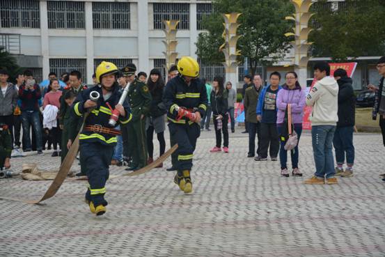 消防技能大比武分为消防水枪与干粉灭火器灭火2个内容,由各系选派男女各2名队员参加。52名参赛者随着裁判一声“开始”令下,以最快的速度穿好消防战斗服,迅速拿起消防水枪和水带跑到前方举手示意,打开水带开关,一股水流喷涌而出形成一道水柱冲向空中。喷水后,参赛者放下水带继续往前跑,到达致远楼对面前坪的模拟火灾现场,拿起干粉灭火器对准火源根部喷洒,一团熊熊大火瞬间被熄灭。当白色干粉还在空中漂浮时,比赛者已经在返回终点的途中了。笨重的战斗服,紧凑的比赛过程耗尽队员的大半体力,尽管跑得气喘吁吁,但每一位队员都全力以赴,认真地完成了比赛。经过激烈的角逐,体育系的刘湘、谢婷荣获消防技能比武一等奖。