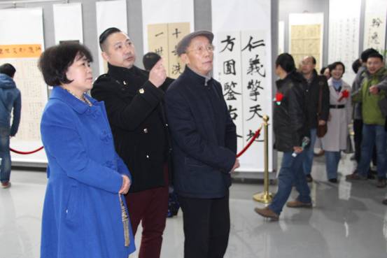 领导、嘉宾们兴致勃勃地观看了师生优秀书法作品展。