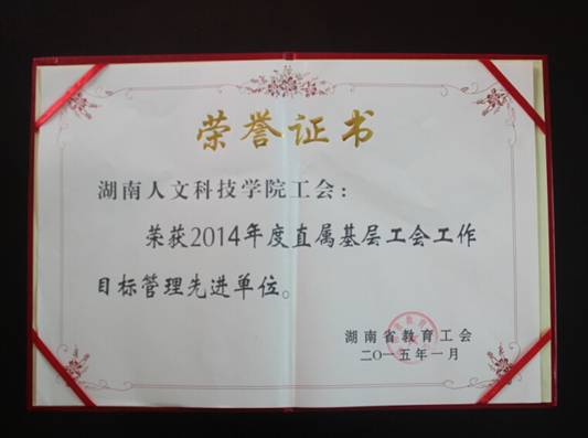 3月31日,在湖南省教育工会第五届委员会第二次全体委员(扩大)会上传来喜讯,太阳成官网工会被评为湖南省教育工会2014年度直属基层工会工作目标管理先进单位。