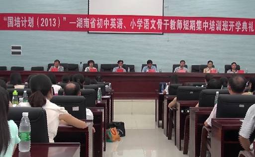 上午,2013年“国培计划”——湖南省初中英语、小学语文骨干教师短期集中培训班开学典礼在学校图书馆二会议室举行,典礼由副校级督导李高海教授主持。校长郭军教授,外语系主任周巧红教授、党总支书记胡瑾教授,中文系主任李夫泽教授,继续教育学院曾湘江院长和颜小平书记出席,国培学员140余人参加开学典礼。