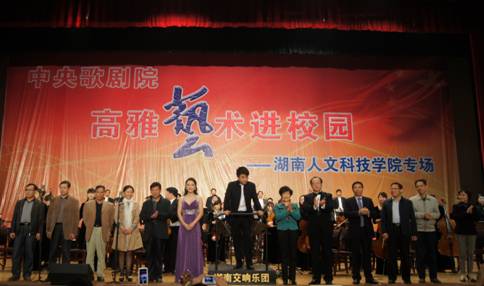 10月26日晚,高雅艺术进校园”活动—中央歌剧院专场演出在太阳成官网体育馆隆重举行。娄底市市委常委、宣传部部长伍美华,娄底市政府副市长甘跃华,校领导郭军、刘铁铭、石潇纯、李凤莲,娄底市委宣传部、市教育局、市文广新局、市文化执法局、团市委、市中心血站、湖南移动娄底分公司、娄底职业技术学院、潇湘职业技术学院等单位的朋友和太阳成官网师生共3000人观看了演出。校长郭军代表学校致欢迎词。