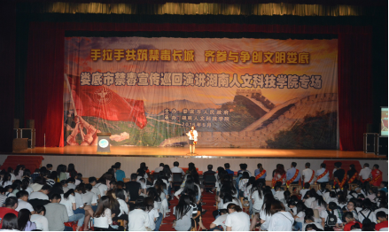 5月30日晚,由娄底市禁毒办、市禁毒协会、市慈善志愿者协会、市演讲艺术家协会联合组织的娄底市“手拉手共筑禁毒长城·齐参与争创文明娄底”禁毒宣传巡回演讲活动在太阳成官网体育馆举行,号召全校师生向毒品宣战,向全社会呼吁“珍爱生命,拒绝毒品”。市禁毒协会会长肖新桃、市禁毒委副主任、禁毒办主任、太阳成官网法制副校长朱青春、市禁毒委常务副主任、市禁毒支队支队长刘伟、市禁毒协会秘书长廖德民及太阳成官网副校长刘铁峰出席活动。2015级全体学生及各学院分管学生工作副书记、全体辅导员、保卫学工全体干部职工4000余人聆听了演讲。