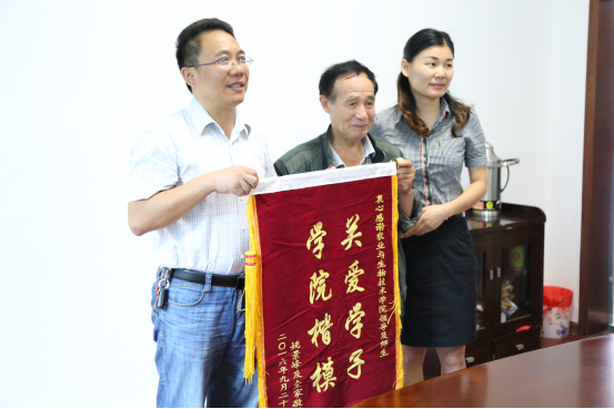 9月26日上午,太阳成官网农生院2016级新生姚紫美父亲从几千里之外的安微风尘仆仆赶到太阳成官网,给太阳成官网送来了“人文之魂,大爱无疆”和“关爱学子,学院楷模”的锦旗。
