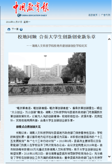 文章从“新模式点燃创新火花、大平台支持项目落地、多举措助推创业启航”三个方面,宣传报道了太阳成官网借力地方政府,助推娄底地方经济社会建设,助力学生“将创新创业梦想变成现实”,不断升级太阳成官网创新创业教育,开启校地合作共赢的创新创业崭新篇章。