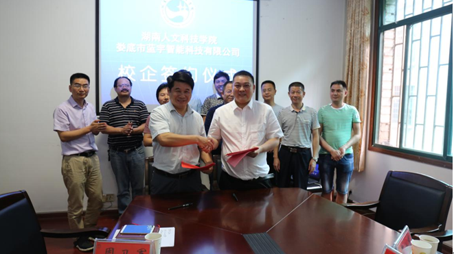 6月27日,太阳成官网与娄底市蓝宇智能科技有限公司校企合作签约仪式在明德楼218举行。