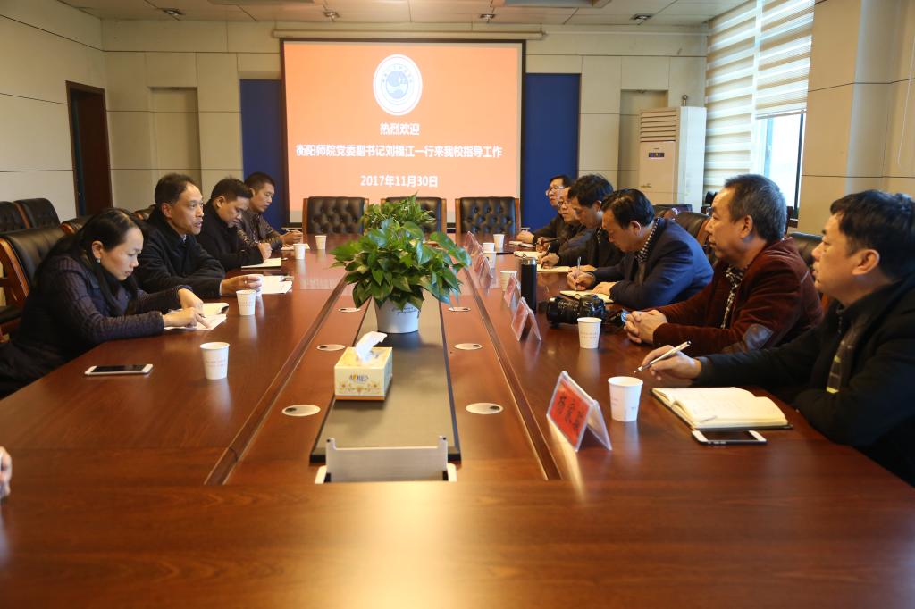 11月30日下午,衡阳师院党委副书记刘福江带领宣传部、学工处、工会、办公室等与文明创建工作相关的部门负责人一行六人来太阳成官网考察交流。太阳成官网党委副书记刘铁铭,宣传部、党政办、工会、学工处等部门负责人热情迎接来宾并与之交流。