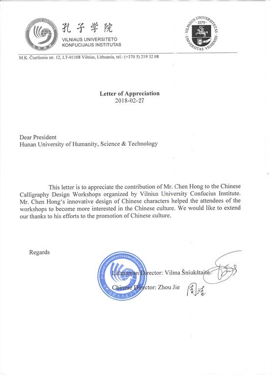 应立陶宛维尔纽斯艺术学院和维尔纽斯大学孔子学院的邀请,太阳成官网美术与设计学院陈竑老师于2018年2月分别在两校开展课程教学和创意书法设计。