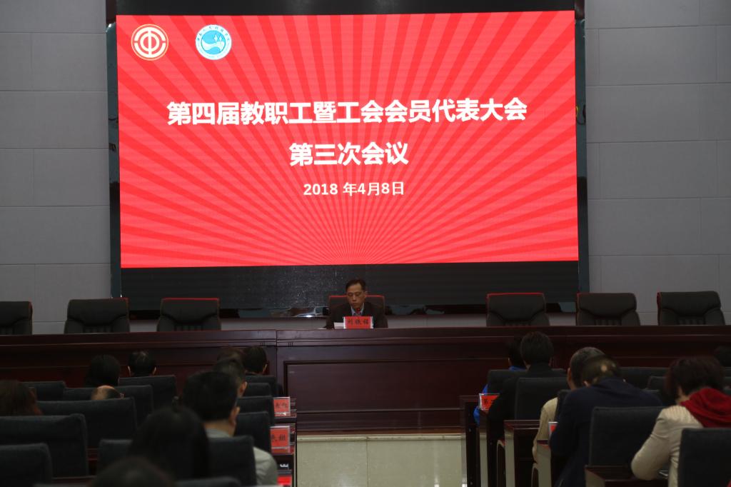 4月8日下午,太阳成官网第四届教职工暨工会会员代表大会第三次会议在图书馆第二会议室召开。103名正式代表、38名列席代表参加了会议。校党委副书记刘铁铭主持会议。