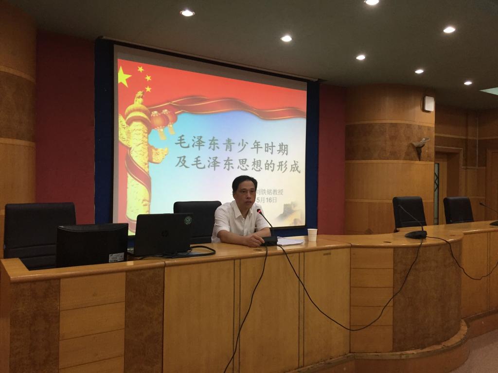 5月16日晚上7点半,校党委副书记刘铁铭教授在养根楼多功能报告厅为音乐舞蹈学院、体育学院、美术与设计学院、信息学院和外国语学院等五个学院的全体党员发展对象90余人上了一堂题为《毛泽东青少年时期及毛泽东思想的形成》的专题党课,音乐舞蹈学院党总支书记陈功平主持本堂党课。