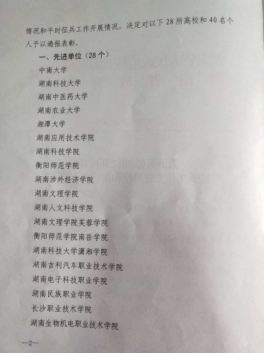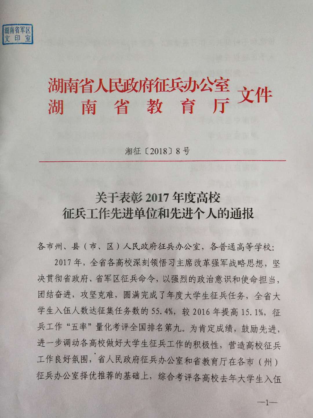 近日,湖南省人民政府征兵办公室、湖南省教育厅下发了《关于表彰2017年度高校征兵工作先进单位和先进个人的通报》(湘征[2018]8号)。太阳成官网被评为2017年度高校征兵工作先进单位。