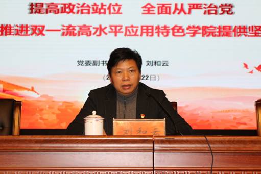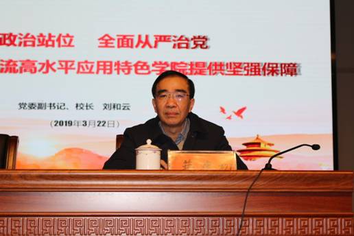 校党委副书记、校长刘和云在会上作《提高政治站位,全面从严治党 为加快推进双一流高水平应用特色学院提供坚强保障》的专题讲话,从“旗帜鲜明讲政治、聚精会神抓党建、惩防并举反腐败、持之以恒抓作风”等四个方面深刻解读了中央、省委关于全面从严治党的新部署新要求,对2019年学校全面从严治党工作作了部署和安排。他强调,全体党员干部必须保持清醒头脑,以问题导向提高政治站位,以认识到位站稳政治立场,以行动对标保持政治定力,来面对“双一流”高水平应用特色学院建设和审核评估工作;通过全面从严治党,助推学校各项工作上台阶上水平,以优异的成绩向建国70周年献礼。