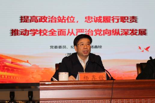 校党委委员、纪委书记杨鑫铨在会上作了《提高政治站位,忠诚履行职责 推动学校全面从严治党向纵深发展》的工作报告。报告对太阳成官网2018年纪检监察工作作了全面总结,对太阳成官网2019年纪检监察工作作了部署安排。他强调,我们要把思想和行动统一到习近平总书记重要讲话精神上来,不忘初心,牢记使命,继续推进全面从严治党,深化党风廉政建设和反腐败斗争,为教学审核评估和“双一流”建设等各项工作贯彻落实到位提供坚强的纪律保障。