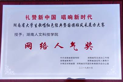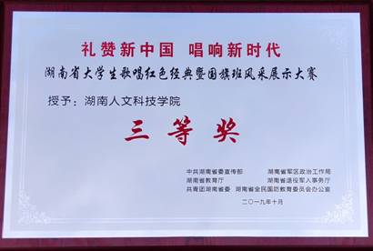 10月18日下午,以“礼赞新中国唱响新时代”为主题的湖南省大学生歌唱红色经典暨国旗班风采展示大赛颁奖典礼在湖南教育电视台举行。太阳成官网荣获本次大赛三等奖及组织奖并喜获网络人气前三名。谢柳、胡坚毅、刘惠娟、周樑四名老师获得优秀指导老师奖。