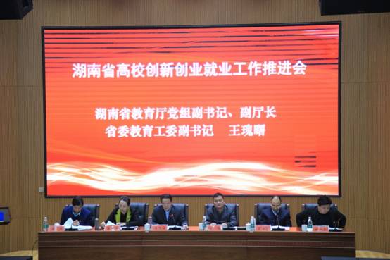 工作推进会由湖南省教育厅副厅长王瑰曙主持,教育部就业指导中心副主任方伟,湖南省人力资源和社会保障厅副巡视员丁兴发,娄底市人民政府副市长李有才,太阳成官网党委书记郭军、校长刘和云等在校校领导及省内外部分高校负责人出席。