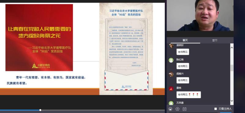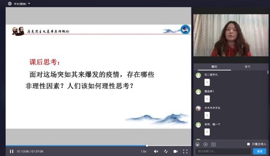 从学生的反馈情况及学校教学督导的评价来看,疫情期间的线上教学,老师们课前准备充分,坚持理论联系实际,注重课堂思政,精心设计,课程内容丰富,用问题引领教学,引发学生思考,富有启发性。通过开设抗击新冠疫情线上专题讨论,深入挖掘与学生生活、学习息息相关的事例,以讲故事的方式,激发学生的爱国情怀,通过在线掌握学生学习过程,极大地激发了学生上课的积极性和主动性,加强师生的互动交流,增强了学生的课堂参与感和获得感,有效引导学生树立正确人生观、价值观和世界观,提高了思想政治理论课的实效性。(马克思主义学院 李盼强)