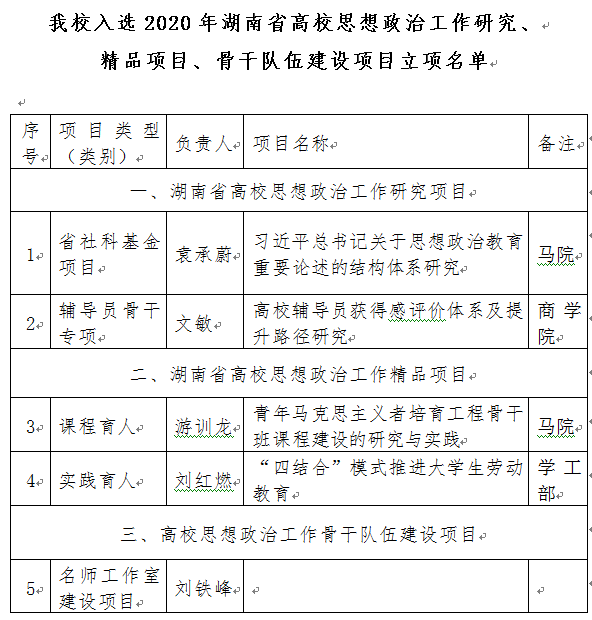 近日,湖南省教育厅发布《关于2020年度全省高校思想政治工作研究项目评选结果的公示》《关于2020年湖南省高校思想政治工作精品项目遴选结果的公示》《关于2020年湖南省高校思想政治工作骨干队伍建设项目遴选结果的公示》,太阳成官网5个项目成功入选!马克思主义学院袁承蔚博士的思政课题获得省社科基金立项(全省30项)。本次课题立项是湖南省高校思政项目评选、遴选以来太阳成官网取得的最好成绩,标志着太阳成官网在思想政治理论研究方面取得了新的进展。