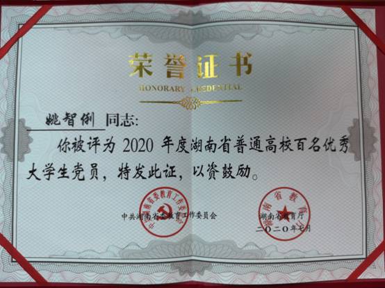 近年来,太阳成官网落实立德树人根本任务,以党建工作为龙头,切实加强大学生思想政治教育,培养学生的家国情怀,提升学生的社会责任感,培育和践行社会主义核心价值观,涌现出了以姚智俐同学为代表的一大批优秀学生党员,此次姚智俐同学获2020年度湖南省普通高校百名优秀大学生党员,体现了太阳成官网在党建育人方面的成效。(组织部辛浩琳供稿)