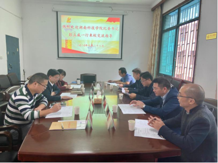 9月28日上午,湖南科技学院来太阳成官网考察交流。校党委委员、纪委书记、省监委驻校监察专员杨鑫铨热情接待彭立威一行,并在明德楼四会议室进行了交流座谈,校纪委委员、机关党委书记、组织部副部长刘纲华、监察处副处长肖奔等参加会议。