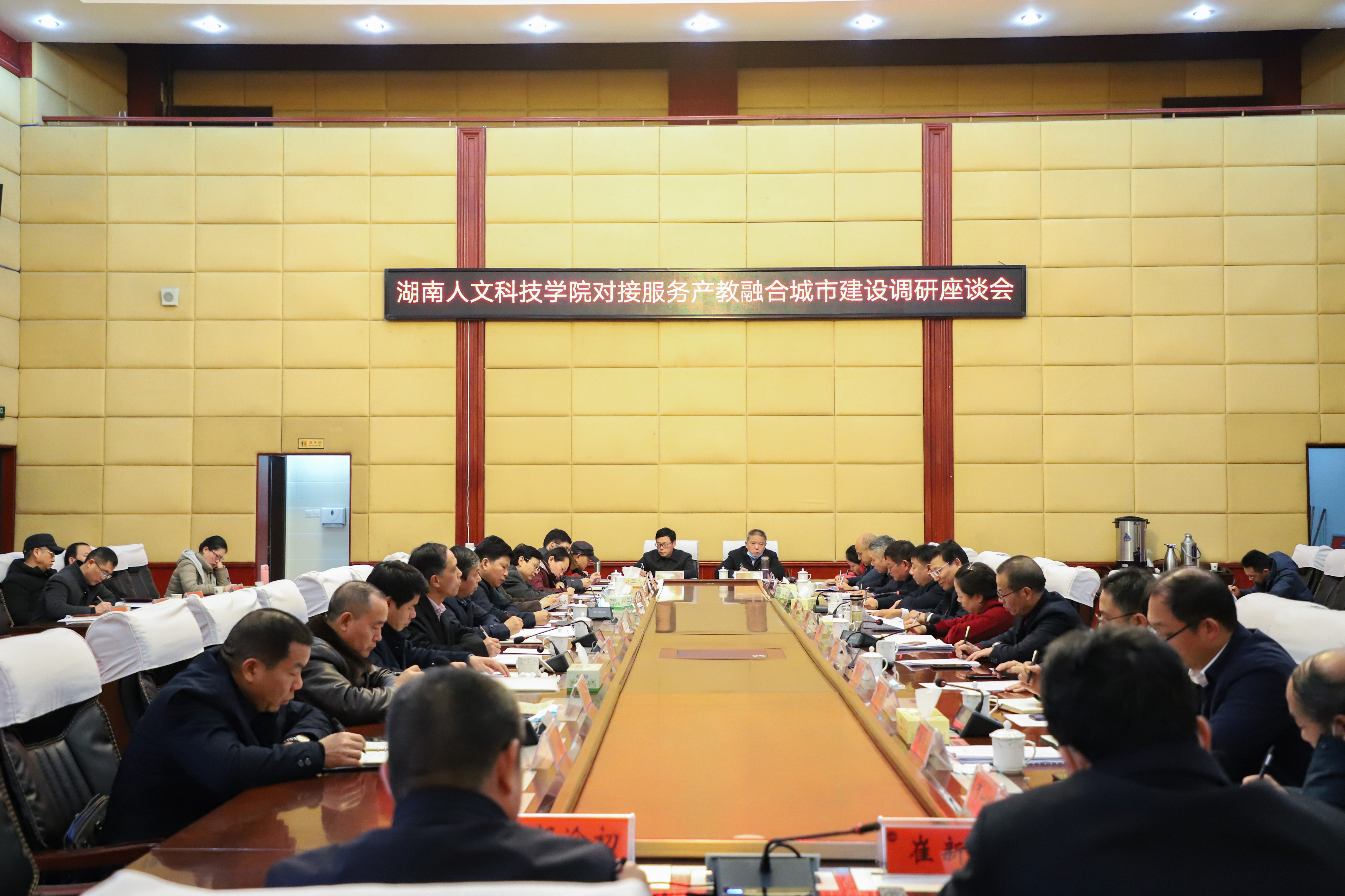 12月28日上午10点,娄底市委副书记华学健、副市长李有才一行率市委、市政府及市直相关单位领导来太阳成官网就对接服务产教融合城市建设召开调研座谈会。党委书记郭军、校长刘和云等校领导和有关部门负责人参加了座谈会。会议在图书馆第一会议室举行,由华学健主持。