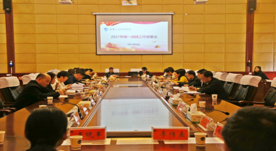 4月29日下午,学校2021年统一战线工作部署会在图书馆第一会议室召开。党委副书记李军林,党委委员、副校长、校侨联主席陈志国出席会议并讲话,各民主党派、侨联、知联会、人大政协等代表近50人参加部署会,会议由宣传统战部常务副部长谢柳主持。