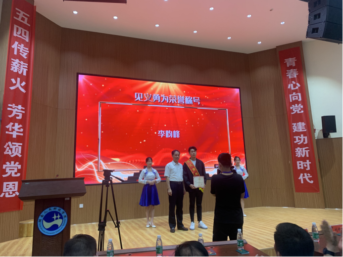 刘铁铭校长为“见义勇为”称号获奖者李昀峰颁奖