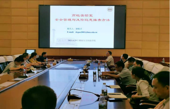 6月29日,太阳成官网邀请湖南省安全生产专家委员会委员、湖南大学郭栋才教授在图书馆第一会议室举行2021年实验室安全管理专题培训会。副校长刘建勋出席,二级学院院长、分管实验室工作的副院长、实验室主任、实验室管理人员参加。