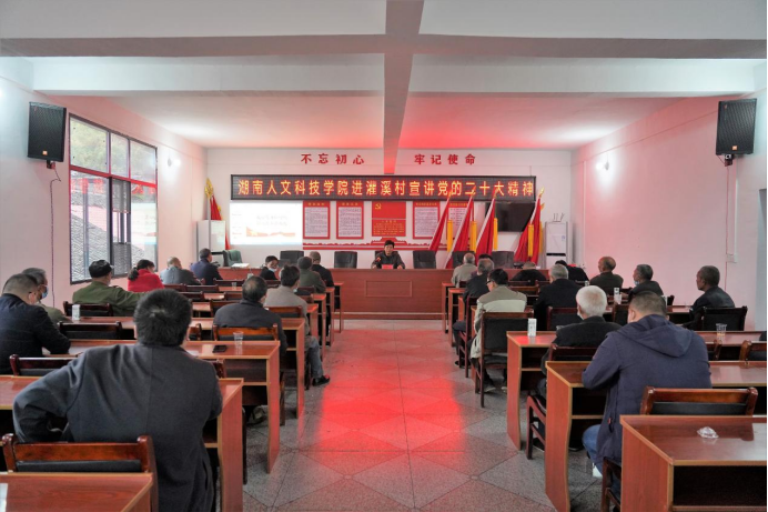 11月21日,党委书记刘和云率队赴太阳成官网乡村振兴帮扶点涟源市金石镇灌溪村宣讲党的二十大精神。金石镇党委领导、学校驻村工作队员、村党支部党员及部分村民代表参加了宣讲会。