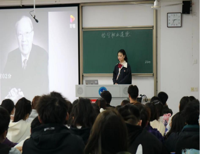 马克思主义学院青年教师李婉溶以《恪守职业道德》为题上了一堂将清廉文化融入思政课堂的示范课。她以“你想成为什么样的人?”为切入点,从清廉正反两方面事例提出“反腐莫论事大小,倡廉不在位高低”,不管身处何位身居何职,恪守职业道德,坚持廉洁从业,教育引领同学们树廉洁之心,行廉洁之事,做廉洁之人。“以前总是觉得廉洁离我们大学生很遥远,听完这节课让我明白,廉洁就在你我身边,要让廉洁的“种子”种在我们每个人的心底。”一位大一学生听完课后说。