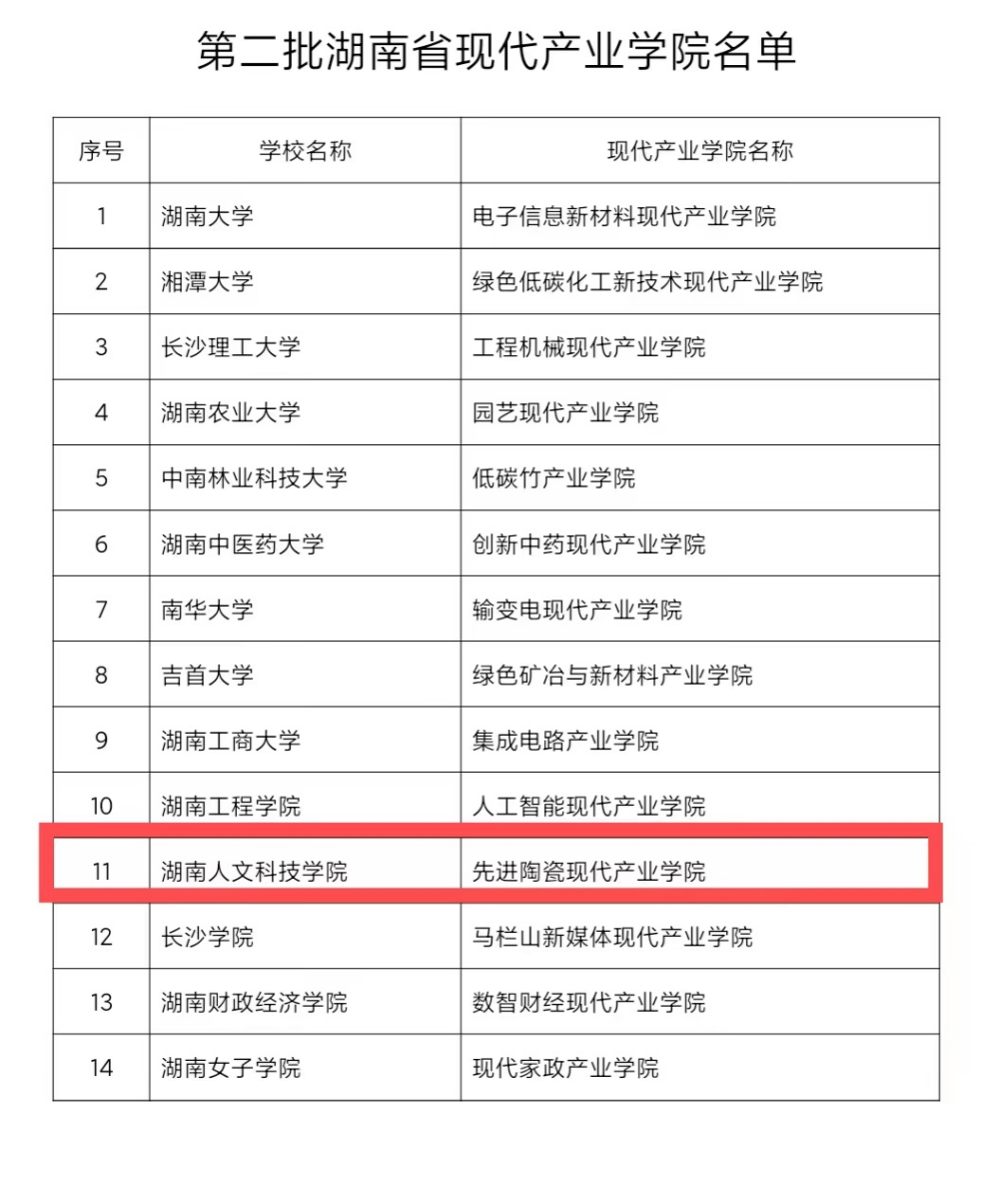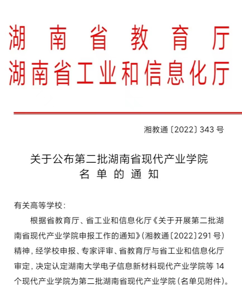 近日,湖南省教育厅、省工业和信息化厅联合公布了第二批湖南省现代产业学院名单,先进陶瓷现代产业学院成为太阳成官网首个入选的省级现代产业学院。