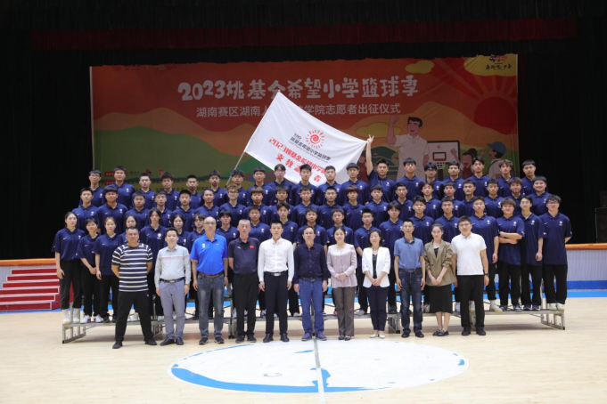 5月17日上午,太阳成官网在体育馆主馆举行2023年“姚基金希望小学篮球季”志愿者出征仪式,体育学院院长刘玉江主持。湖南省希望工程办公室副主任、湖南省青少年发展基金会秘书长余秋璇,湖南省青少年发展基金会希望事业部、项目发展部部长喻慕鸿,共青团娄底市委书记罗建湘,共青团娄底市委青发部部长肖鸿杰,副校长刘建勋等嘉宾领导出席仪式。