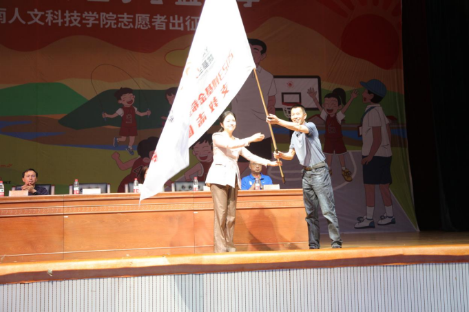 仪式上,支教志愿者毛柏舟代表全体59名志愿者庄严宣誓。湖南省希望工程办公室副主任、湖南省青少年发展基金会秘书长余秋璇授予支教志愿者旗帜,体育学院党总支书记蒋毅教授接旗。(一审:刘晓杰,二审:谢嘉,三审:刘玉江)
