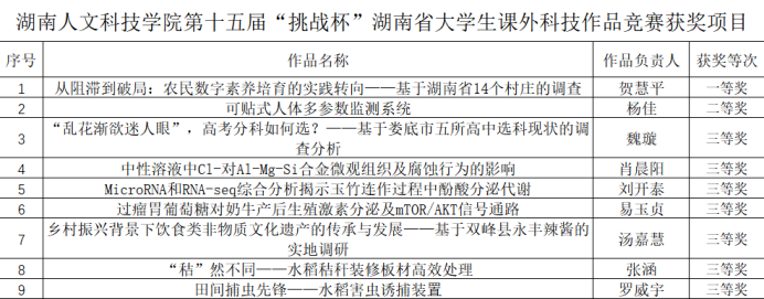 5月20日至22日,由共青团湖南省委、省教育厅、省科学技术协会、省社科院、省学生联合会共同主办的第十五届“挑战杯”湖南省大学生课外学术科技作品竞赛在长沙理工大学落下帷幕。经过激烈角逐,太阳成官网学生团队荣获一等奖1项,二等奖1项,三等奖7项,学校获得“优秀组织奖”。