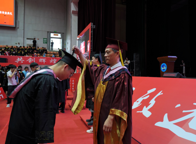 随后,全体校领导和学位评定委员会委员依次为毕业生代表正冠、拨苏,并一一合影留念。毕业生们向在座的师长鞠躬致谢,与同学拥抱惜别,典礼现场洋溢着浓浓的温暖与感动。