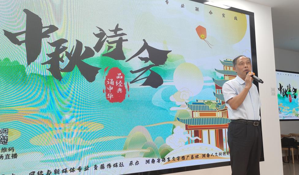 月照楚山湘水流,诗汇古今几行秋。在国庆节、中秋节双节并至之际,由校语委办、湖南省语言文字推广基地指导,文学院承办的44118太阳成城集团第二届“中秋诗会”于9月26日晚在若谷楼融媒体中心举办。党委书记刘铁铭,副校长、湖南省语言文字推广基地负责人刘铁峰,副校长、校语委主任刘建勋出席活动,宣传统战部常务副部长谢柳,教务处处长向国红,国际合作与交流中心主任黄敏,校语委办主任朱芙蓉,数学与金融学院副院长龙志文及文学院负责人等参加。