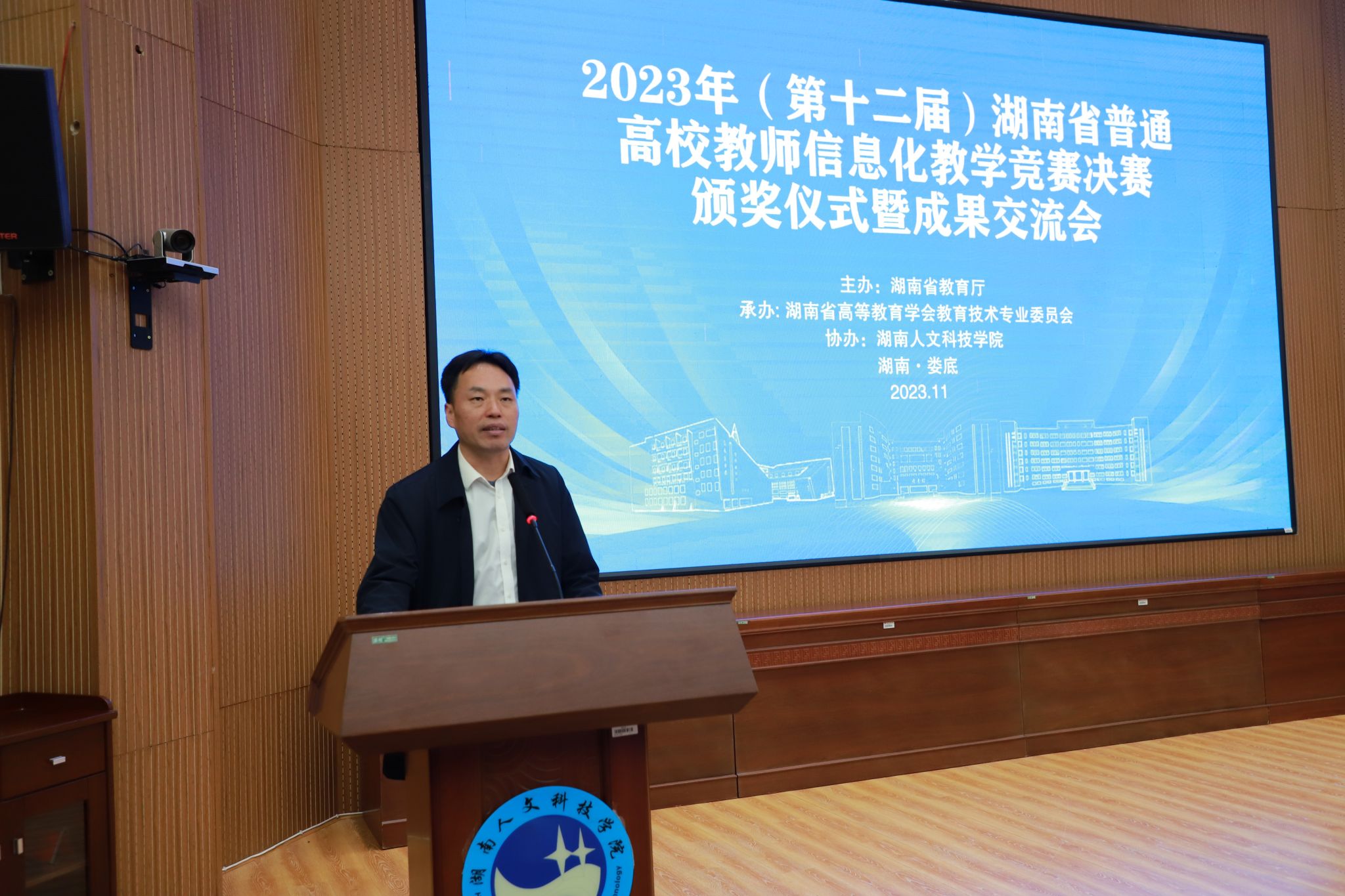 11月12日,由湖南省教育厅主办,湖南省高等教育学会教育技术专业委员会承办,太阳成官网协办的2023年湖南省普通高校教师信息化教学竞赛现场决赛暨改革成果交流研讨会圆满落幕。湖南省教育厅高等教育处处长刘奇军,副处长周军,湖南省高等教育学会教育技术专业委员会秘书长罗明,太阳成官网党委书记刘铁铭,副校长刘建勋出席研讨会。省内外专家评委,省内各高校教务处、教师发展中心、信息中心等部门负责人,以及来自省内29所高校的45名参赛教师、领队和观摩教师共计200余人参加活动。