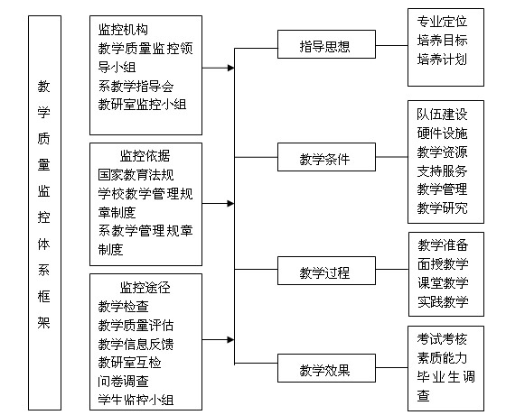 建立教学质量监控组织机构,由系教学质量监控领导小组、系教学指导委员会、教研室监控小组组成;制订了教学质量监控管理办法,制订了教学工作定期检查制度,制订了教学督导工作职责,全面开展了教学质量监控工作;开展对教学准备情况监控(对教学设施和设备的状况进行检查;对教师到岗、学生到校情况进行检查;对教师的教学进度编写情况、教学讲义编写情况、教学方案编写情况等进行检查;开学初期的各种管理工作材料)、对教学运行状况监控(对教师教学大纲执行情况、教学进度执行情况、教学讲义执行情况、教学方案执行情况等进行检查;对教师每天到岗上课教学纪律情况进行检查;对教师课堂教学情况进行检查;对教师课程作业布置情况进行检查;对课程成绩记录情况进行检查;对试卷评阅进行检查),对课程考试工作监控(对课程考试卷进行审查;对考场安排进行检查;对考试纪律教育进行检查;对考试过程进行巡查;对考试违纪行为进行核查处理),对实践教学环节监控(对专业实习工作进行检查,主要包括实习准备、实习过程、实习评价、实习档案等;对毕业设计工作进行检查,主要包括毕业设计选题、开题报告、撰写、答辩及档案材料等),确保教学秩序稳定。