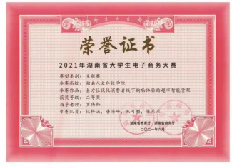 经过激烈角逐,最终由仪梓涵、唐海峰、朱可塑、陈乐乐所在的“F leader”团队获得2021年湖南省大学生电子商务大赛主题赛二等奖、全国大学生电子商务“创新、创意及创业”湖南赛区三等奖,宁卿涵、詹学亮、刘佳一所在的“电商小白”团队获得2021年湖南省大学生电子商务大赛跨境赛二等奖。“一番星”团队与坠入梦“湘”队分别获得由全国大学生电子商务“创新、创意及创业”挑战赛竞赛组织委员会颁发的校级赛特等奖以及一等奖。(齐月、罗伟祎)