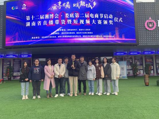 近日,由电子商务国家一流专业建设点与湖南小小鸟科技有限公司联手打造的“晏老板的麻辣”团队项目在湖南省直播带货暨短视频大赛中荣获一等奖。专业负责人刘加林教授带领三区人才电商支队成员以及优秀学生代表受邀一起参加了颁奖仪式,并参观了第十二届湘博会·娄底第二届电商节。