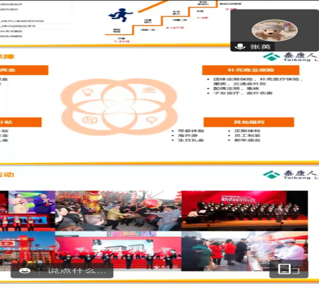 2022年10月25日晚,商学院在高韵楼211召开了泰康人寿线上专场招聘会,康人寿人事张经理就业专干黄鹍鹏以及19级的应届毕业生参加了本次招聘会