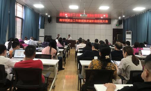 5月31日,商学院在高韵楼101召开就业工作继续推进暨阶段总结大会,党总支书记刘辉主持,全体教职员工参加了会议。