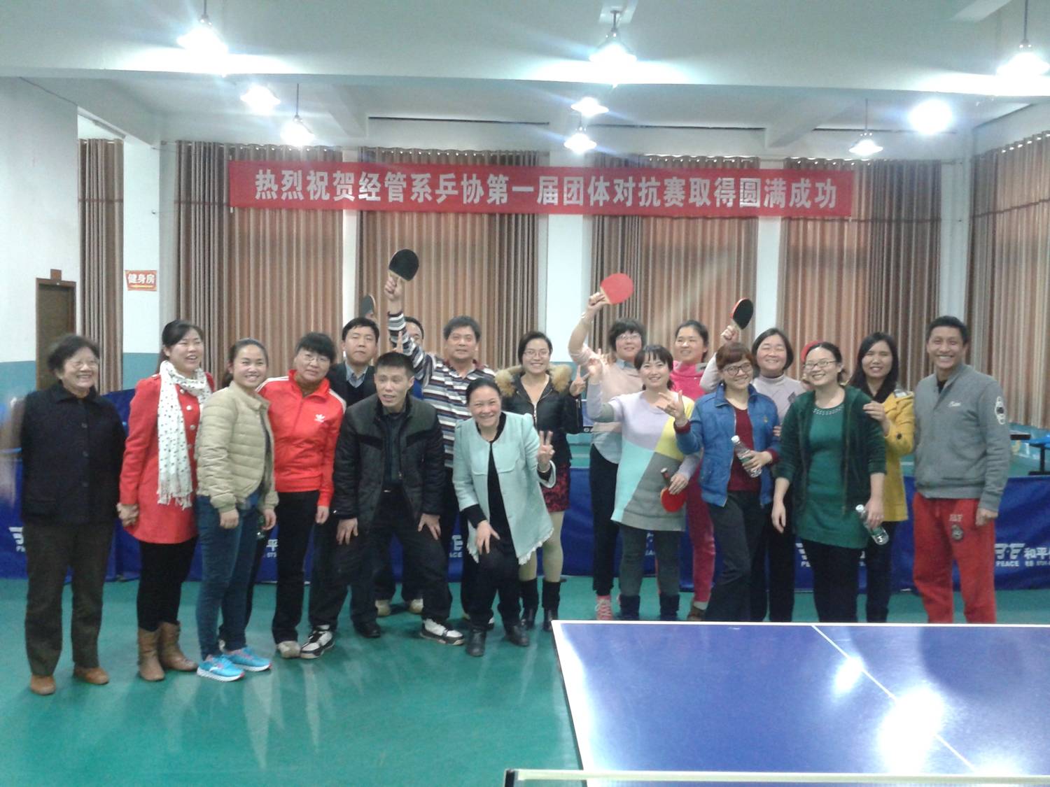 为了进一步丰富经管系工会生活,营造团结友爱的文化氛围,加深同事间的相互交流,提高乒乓球爱好者的竞技水平和综合素质,展现我系蓬勃向上的精神风貌,经管系成立了乒乓球协会,2014年3月22日在学校教工之家成功举办首次团体乒乓球团体比赛,尽显经管风采、尽展团队合作精神。